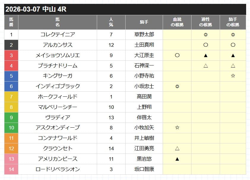 | カチウマの定理 | 中山4R | 予想印 | |