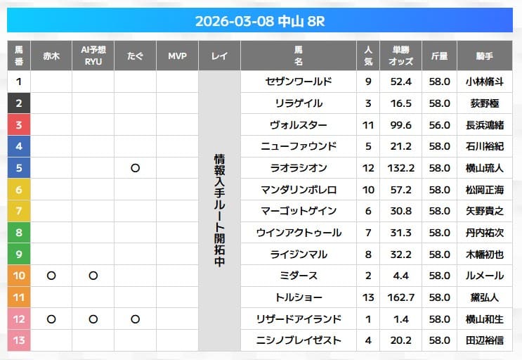 | 最新の的中 | 2026年03月08日中山2R |