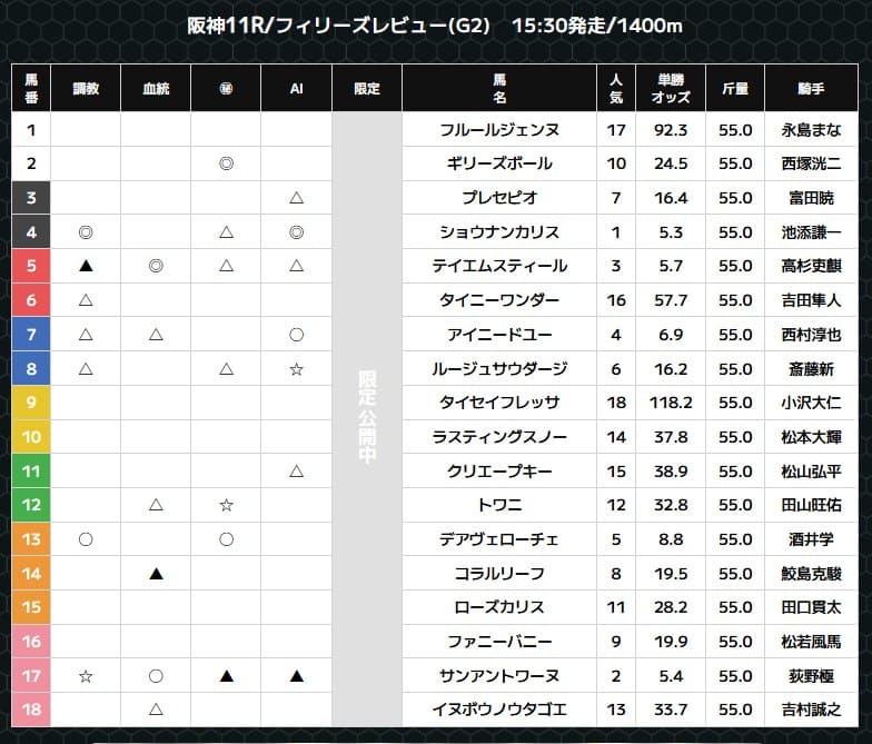 無料で利用できますが、予想は印のみ。自分で予想を組み立てる技量が必要になります。