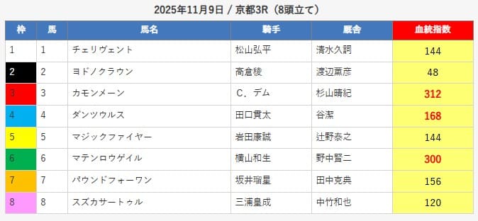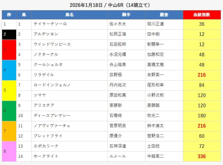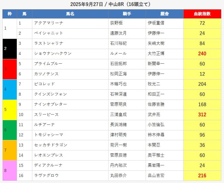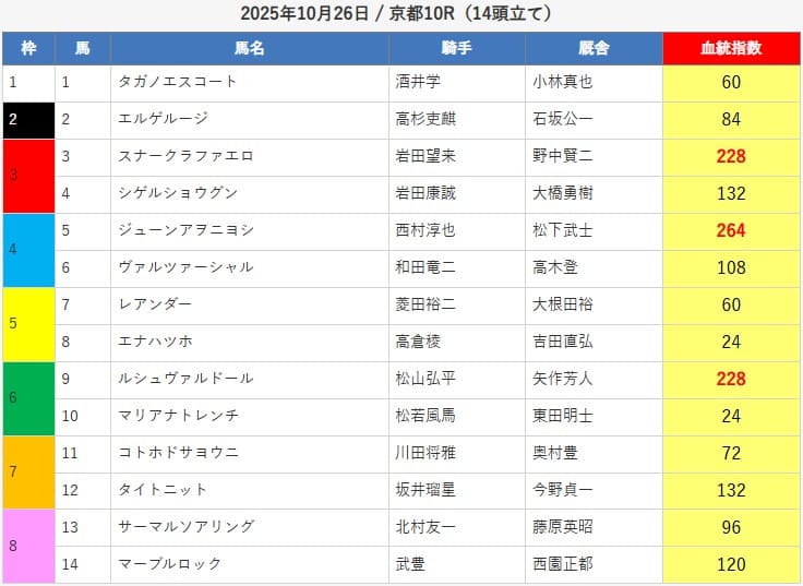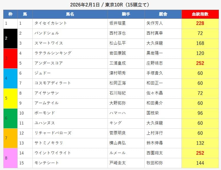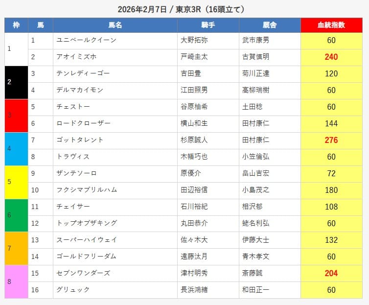 ※画像の指数上位の馬(赤い文字で表示された数値の高い馬)は4頭ですが、現在は3頭になっていました。
