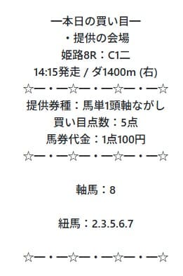ヒモには、1.2.3.6.8番人気がいますが、軸馬が1着に来ただけですでに配当には期待できるでしょう。