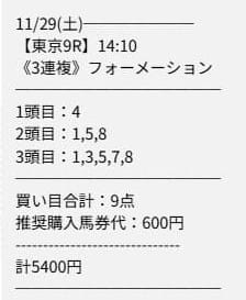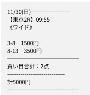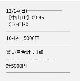 ですが、買い目を確認したところワイドが1点5,000円の日があったりと高い日もあるので、その場合は無理のない金額にしてください。