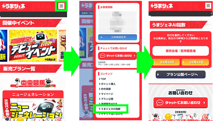 | 確認方法 | 「メニュー」→「コンテンツ」→「うまジェネAI指数」をタップ |