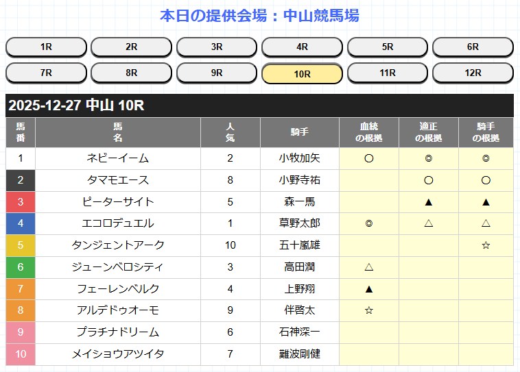 - 検証方法:血統、コース適性、騎手の3つの項目のどれかに予想印がある馬から選出