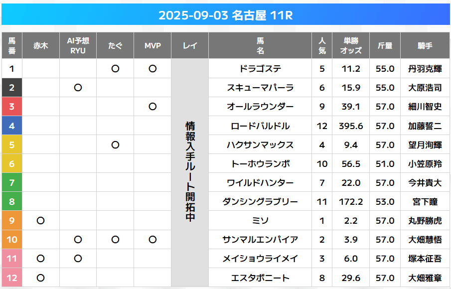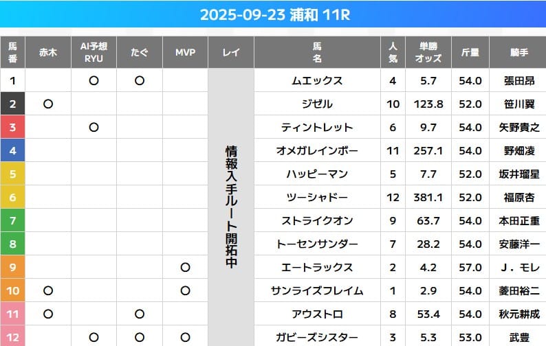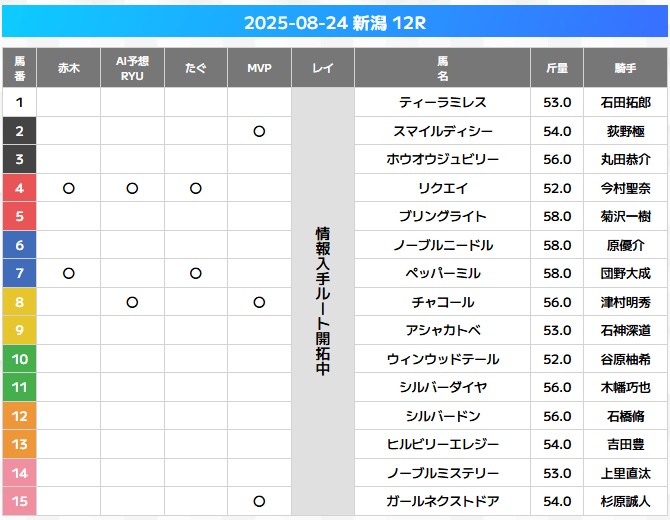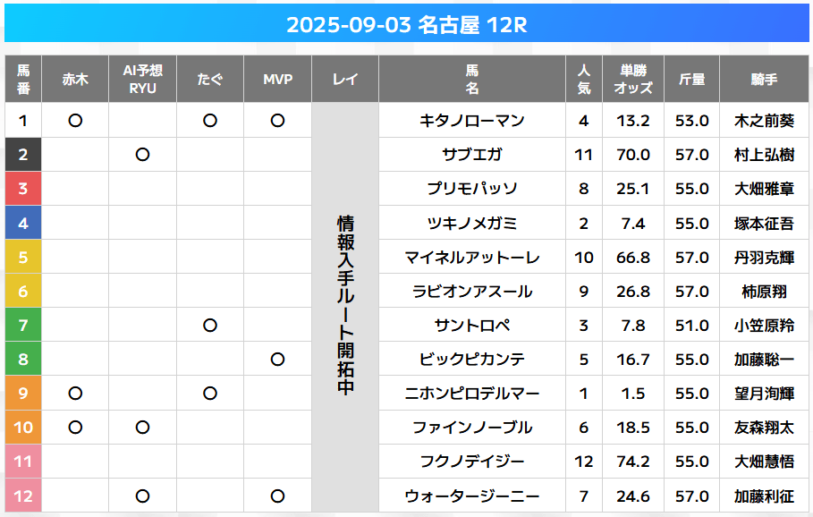 マルのついていない馬を消し馬(馬券に絡みにくい馬)として、逆に馬券に組み入れないという使い方です。上記の画像の場合12頭レースでマルが1つもない馬が7頭いるので消し馬(馬券に絡みにくい馬)は7頭です。この時点で、残りの5頭で馬券を考えることができます。