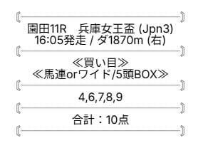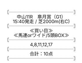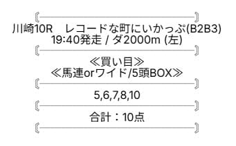 提供される内容は、馬連もしくはワイドの券種で、5頭ボックスでの購入を推奨しています。今回は指定された通りの買い目で実際に馬券を購入し、その精度を確かめました。