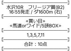 しかし、もう一頭の軸馬⑦タイクーンバゴは、直近5レースで一度も3着以内にも入れていないいわゆる穴馬です。