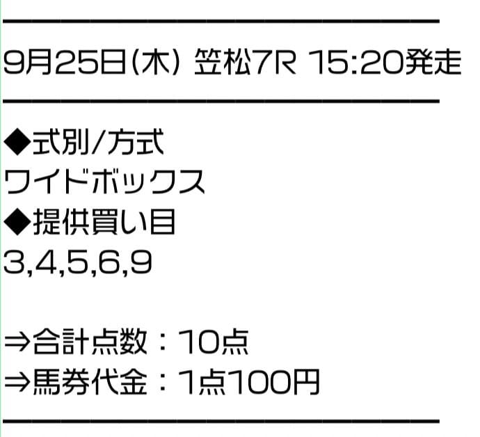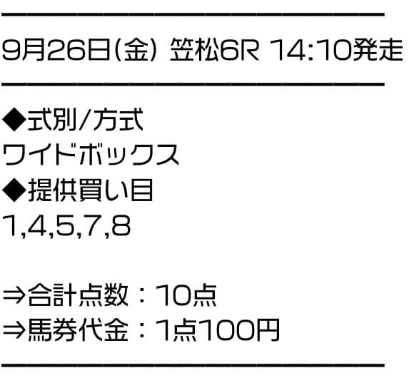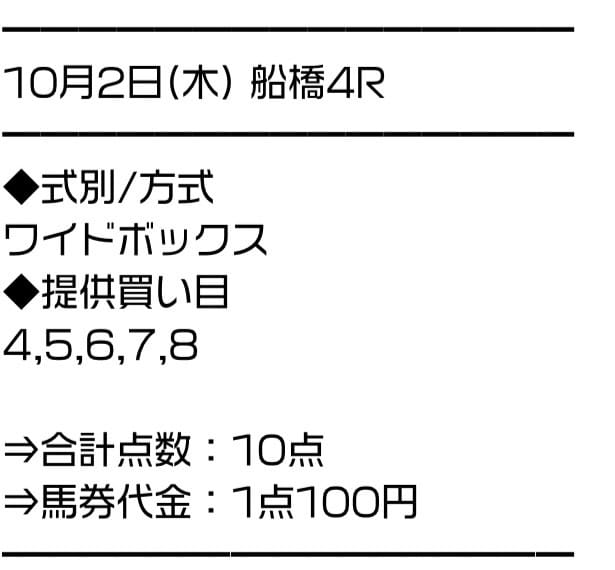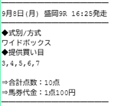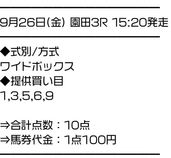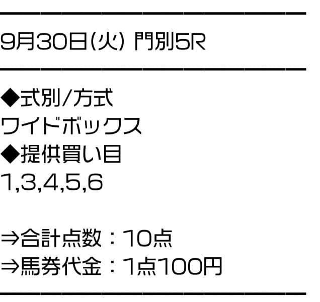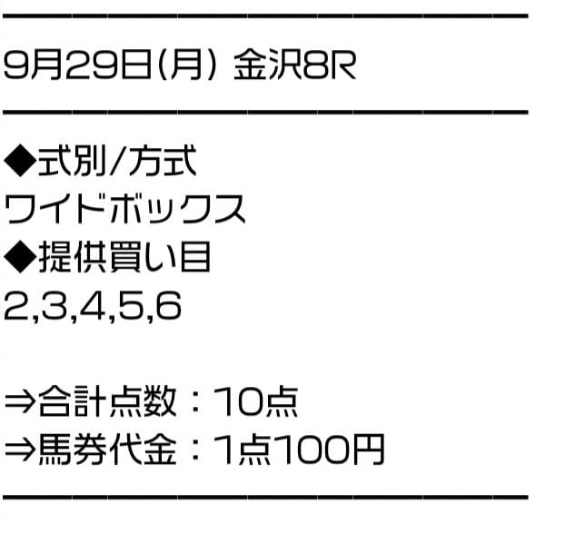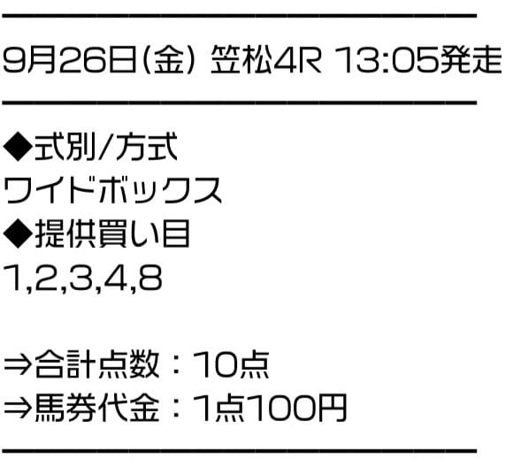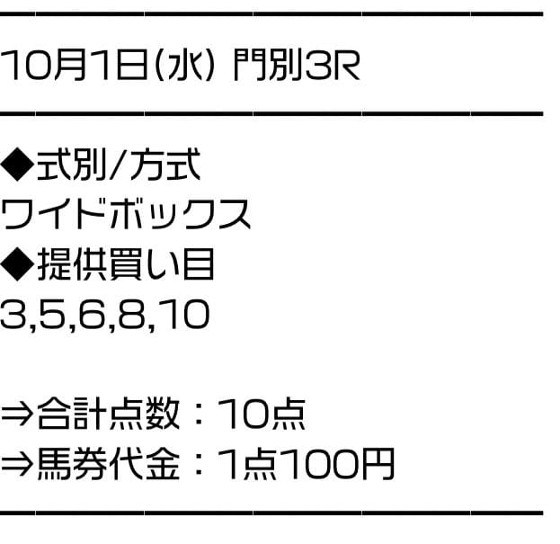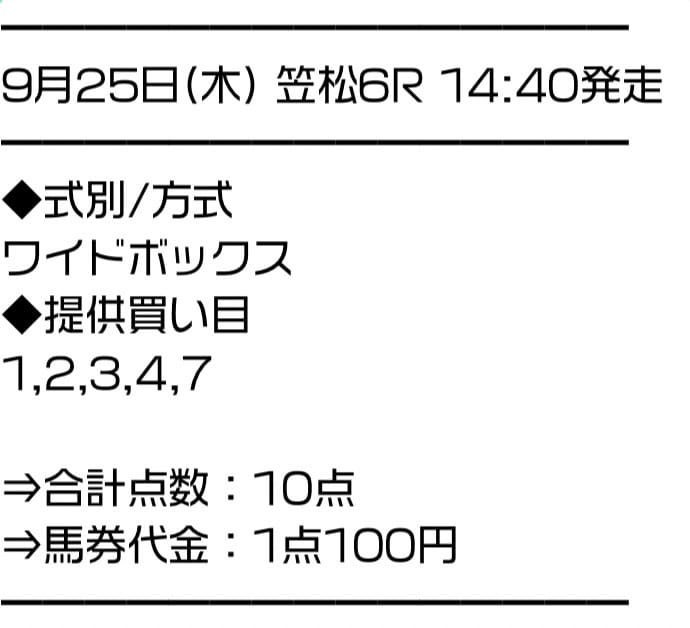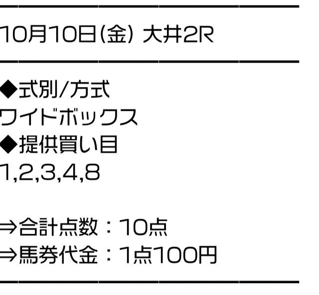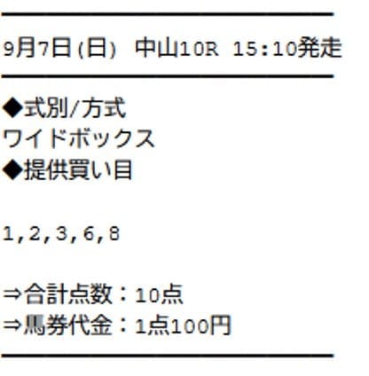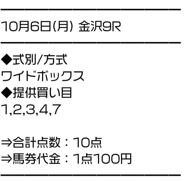 買い目の指示通りワイド5頭ボックスで1点100円、合計1000円の条件で3レース参加しました。