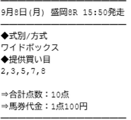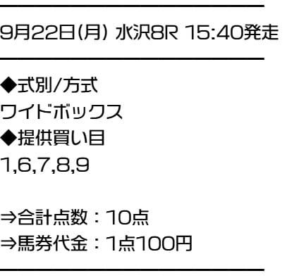 2025年8月30日中京10R | 的中 | 13,220円 | 1322% |