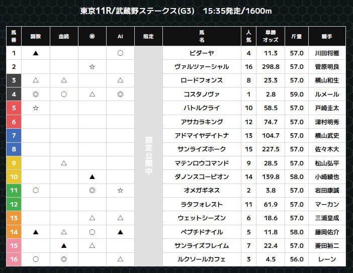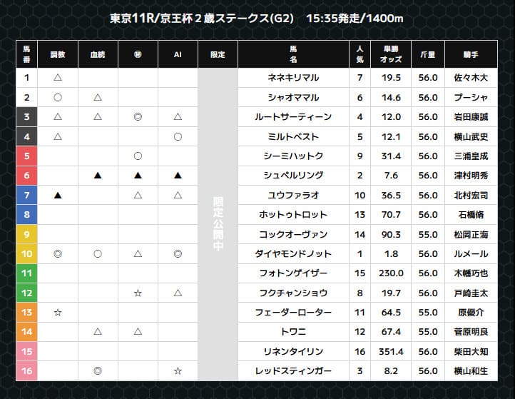 - △連下:2・3着に来る可能性がある馬で3着以内に絡めばまずまずの配当に期待できる