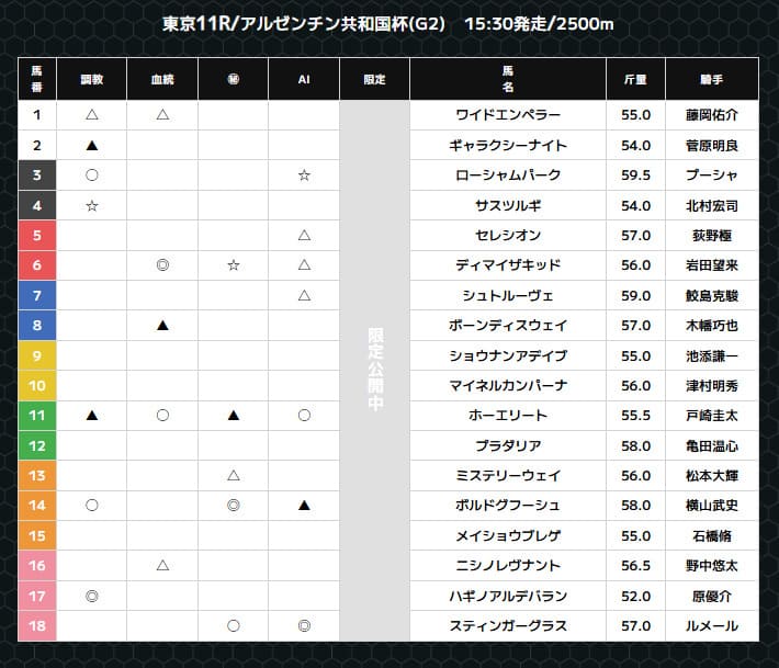 | 無料予想タイプ | 予想印/買い目 | 予想印 | 指数 | ワイド(見解付き) | 3連複/ワイド | 〇の予想公開 | 指数 | ワイド/馬連 | 複勝/ワイド/3連複 | ワイド/馬連/3連複 | ワイド/3連複 | ワイド | 馬連/ワイド | ワイド | 3連複 | 馬単 | ワイド5頭BOX | 3連単マルチ | 馬連 | 3連複/馬連 | ワイド5頭BOX | 指数 | 推奨馬6頭 | 3連複 | 馬単 | 3連複5頭BOX | ワイド5頭BOX | ワイド5頭BOX | ワイド5頭BOX | ワイド3頭BOX | 複勝3頭 | 推奨馬3頭 | ワイド5頭BOX | 推奨馬5頭 | 馬単5点 | ワイド5頭BOX |