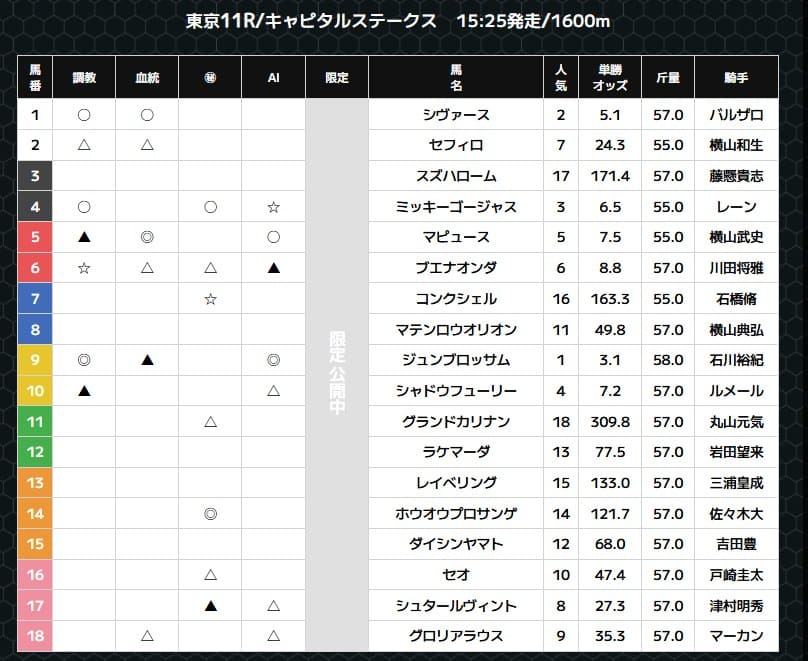 - ▲単穴:◎や○の馬に勝てる能力がある馬で3番手に推奨