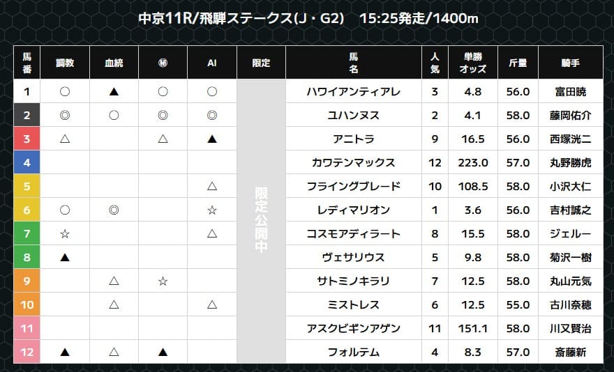 フリッカージャブが調教、血統、AIなどの項がある中で、1頭のみ際立って◎という異例の予想印でした。