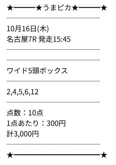 ワイド5頭ボックスで1点100円、合計1,000円の条件で参加しました。