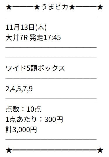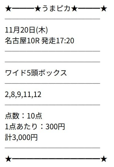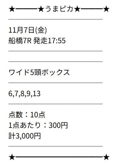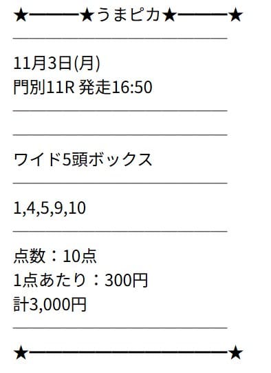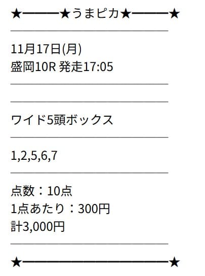 買い目の提供ではないため、自身で券種を選択する必要があります。私は3連複5頭BOXで購入しました。