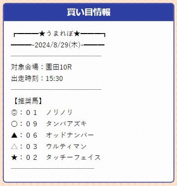 うまれぼがピックアップした馬はこちらで、圧倒的な1番人気のバブルとオッズの高い下位人気を掛け合わせた買い目になっていますね。