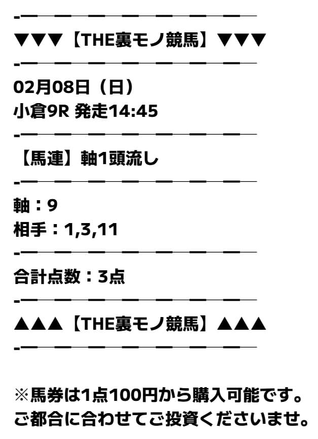 少し金額が低いですが、1点100円の無料予想なので十分でしょう。