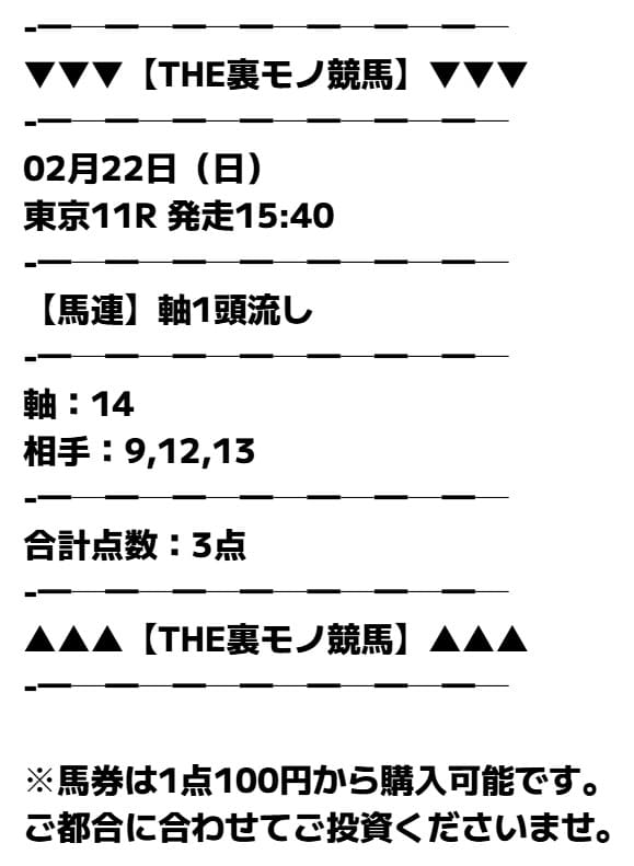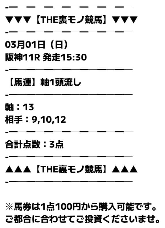1点100円の3点なので、馬券代も300円と安く、試しやすい価格なのでおすすめです。
