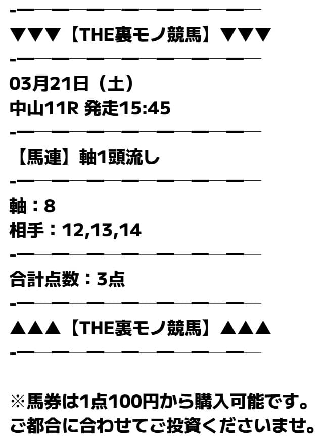 | 禁断の真実 | 85,000円 | 土日4鞍 | 100万円 | 三連単 | 5,000円以内 |
