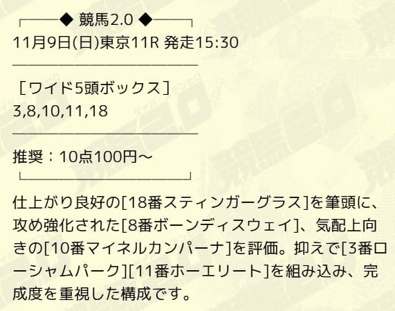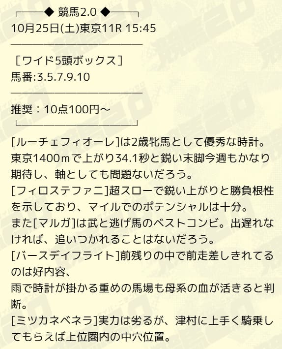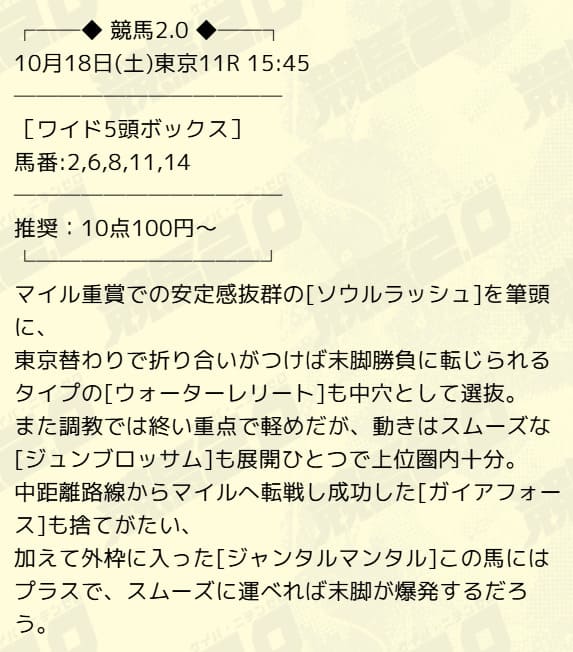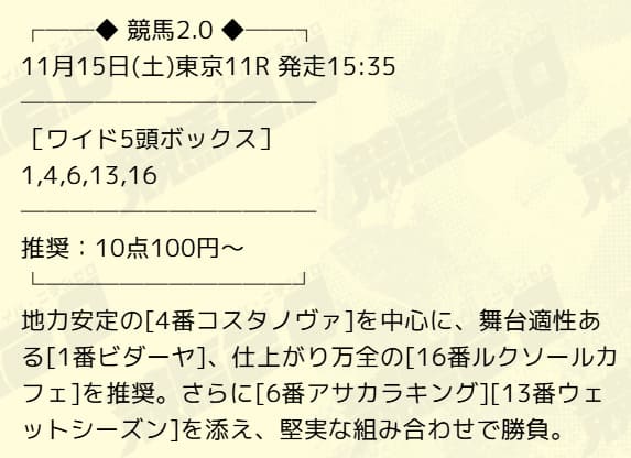 穴馬を入れることで、さらなる高配当が望めそうですが、買い目通り購入するだけでも十分な精度です。