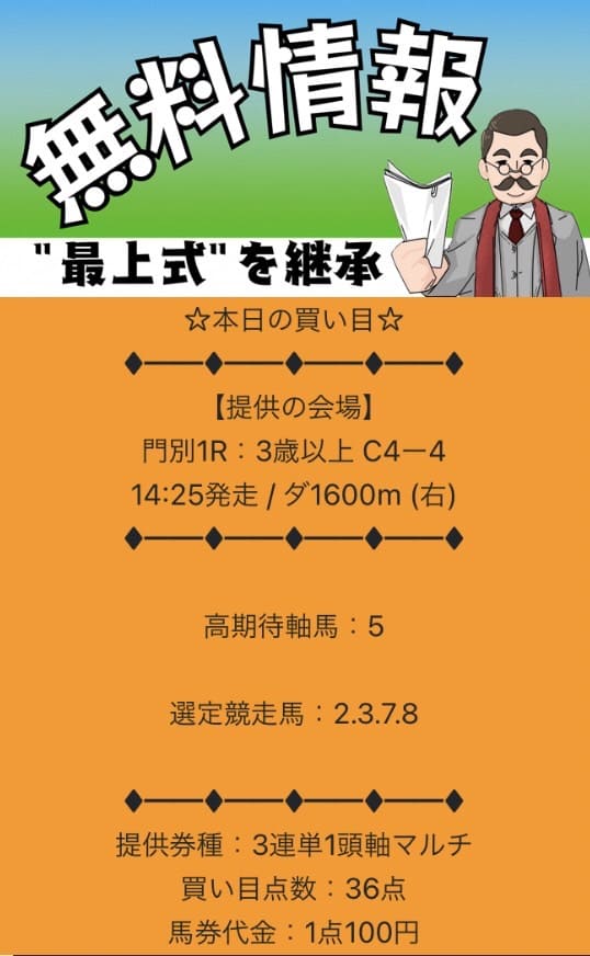 天地神明の評判がよかったので参加。2レース提供で両方的中!これだけ精度高ければリピありかな。