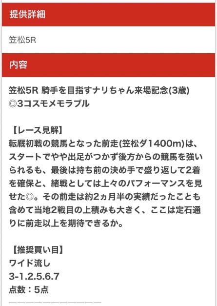 最後は2025年8月28日に開催された笠松5Rの無料予想です。