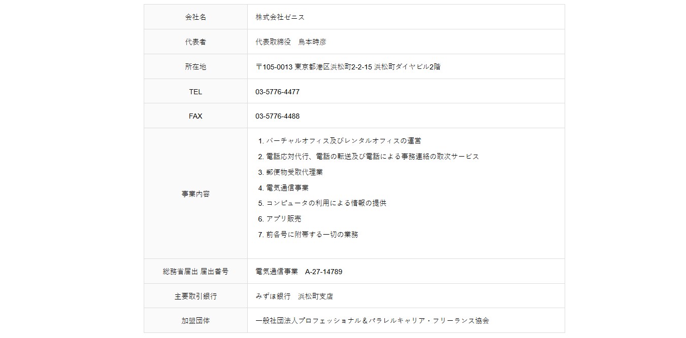 株式会社ゼニスというレンタルオフィスは電話応対代行もやっていますが、特定商取引法に記載された情報はメールアドレスのみ。