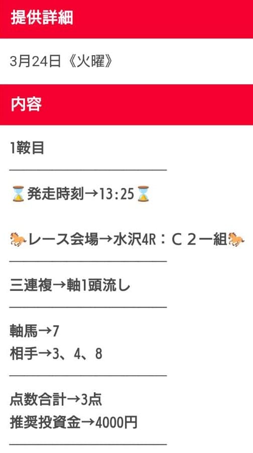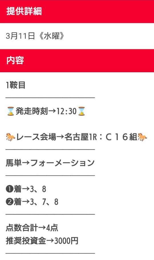 - 提供される予想は馬券代3,600円以内を確約