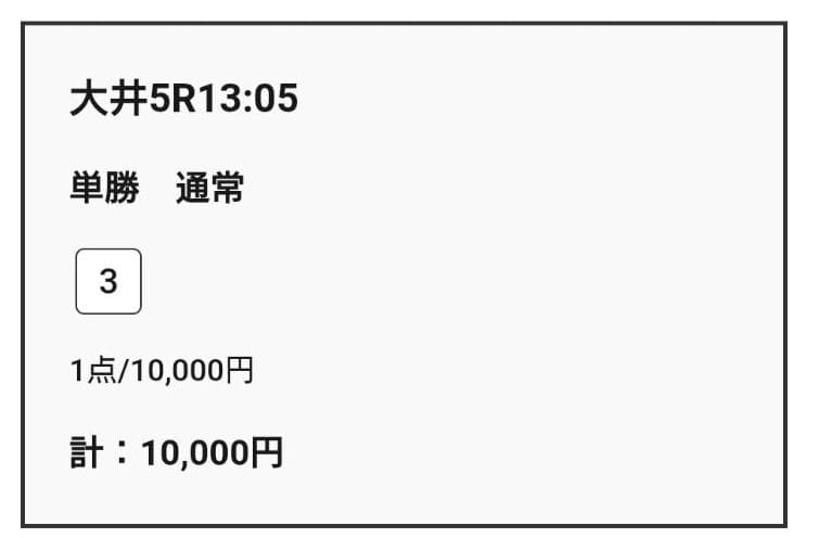 買い目の指示通り単勝1点を購入しました。1点10,000円なので馬券代は10,000円です。