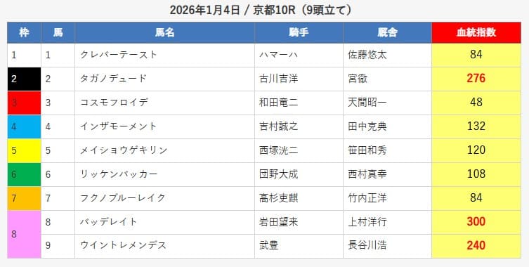 - 選択馬:条件に適した高指数馬を4頭ピックアップ