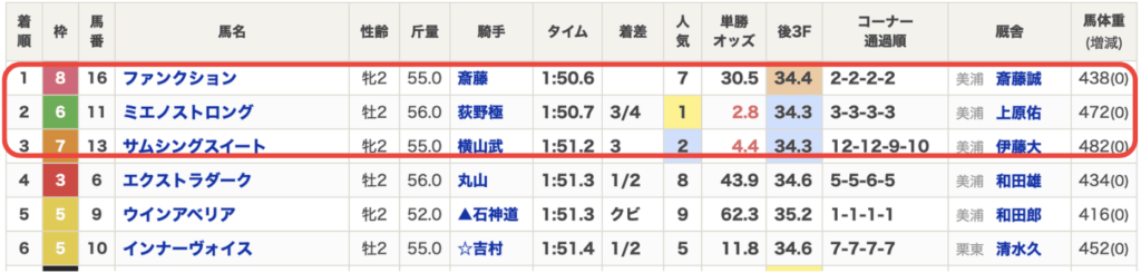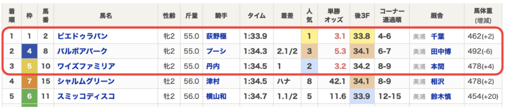 東京競馬場の2歳未勝利戦は、「1番人気 → 3番人気 → 2番人気」と順当に決着し、3連単の配当は4,420円でした。