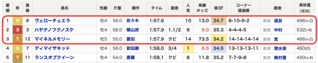 - スローペース: 逃げ・先行馬が止まらず上位に残る