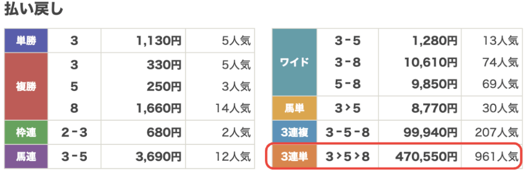 レースは「5番人気 → 2番人気 → 15番人気」で決着し、3連単の配当は470,550円という高配当に。