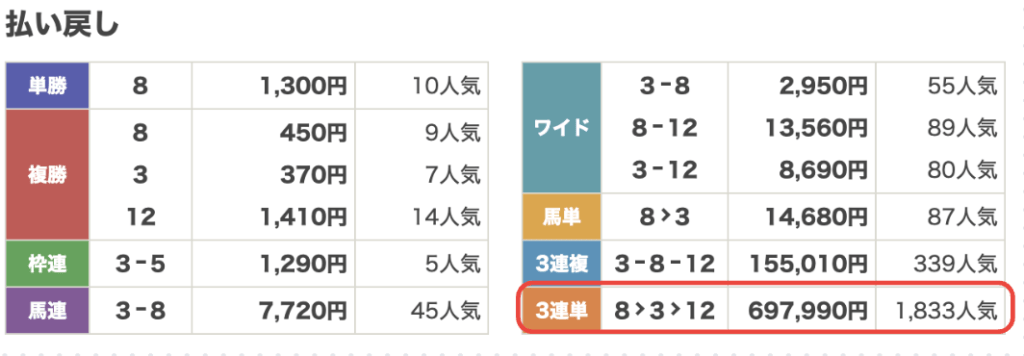 このように、7番人気の馬が1着になったことで、3連単は3連複の10倍以上の配当となりました。