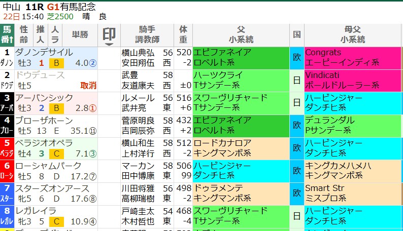 スマート出馬表では脚質が色分けされており、コースの有利脚質(逃げ/先行/差し)と照らし合わせることで精度が上がります。