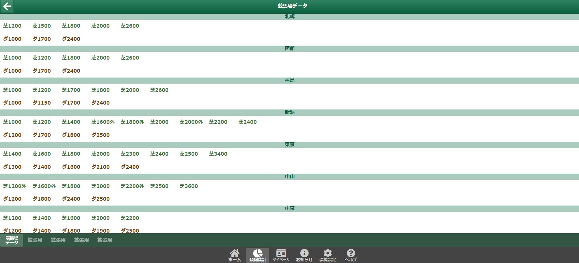 傾向集計には、全国のJRA競馬場のデータが掲載されています。